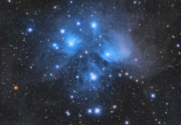In addition to M42, I also did some testing on the Horsehead Nebula (above). For this I chose to only test with Photographic Mode at Gain 0, Offset 30. The total integration before being stopped by cloud cover was 2.1 hours (129×60″). Several nights later, continuing my trend of not having ideal conditions, a 30% moon was up so another bright object was in order. I chose another popular target, the Pleiades star cluster. I obtained 1.9 hours (115×60”) before clouds rolled in and stopped me in my tracks. The processed result is shown below.